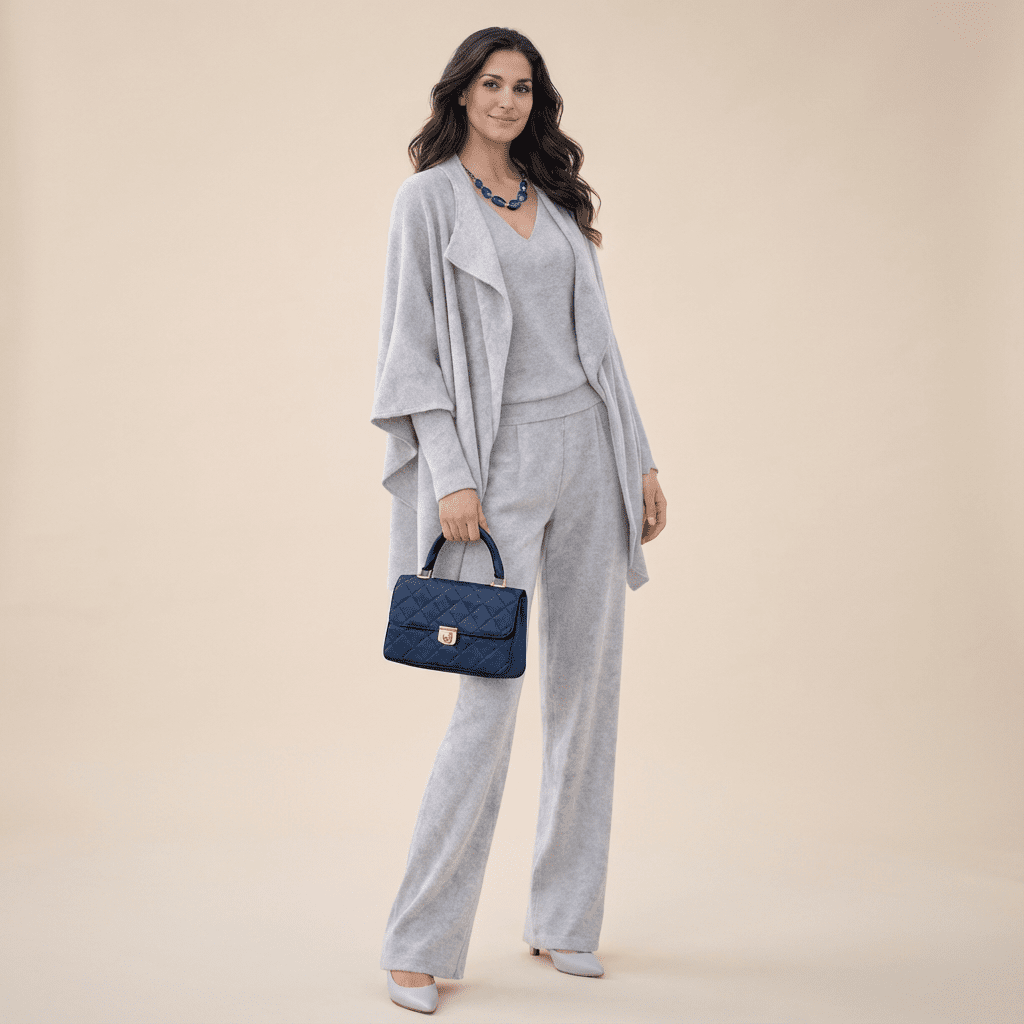 The set includes a comfortable knit top that drapes smoothly over the body, coordinating pants with a relaxed, flattering fit, and a matching outer layer that completes the outfit with a refined, modern touch. Each piece can be worn together for a cohesive look or styled separately to create multiple outfits with ease.